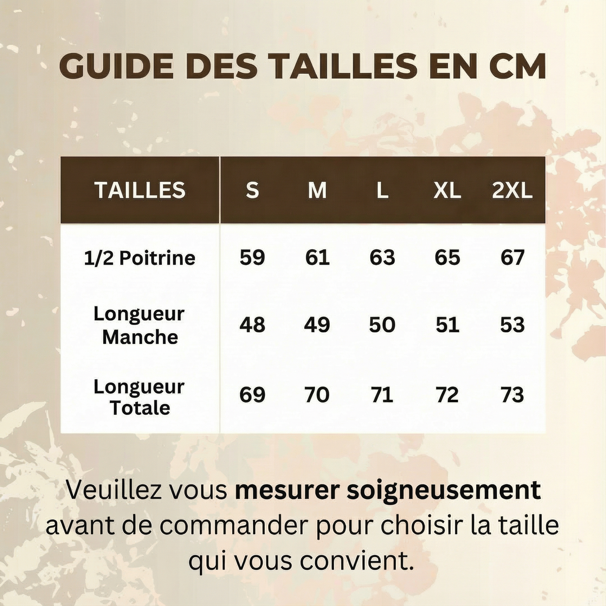 • Taille S : 1/2 Poitrine 59cm | Manche 48cm | Longueur 69cm